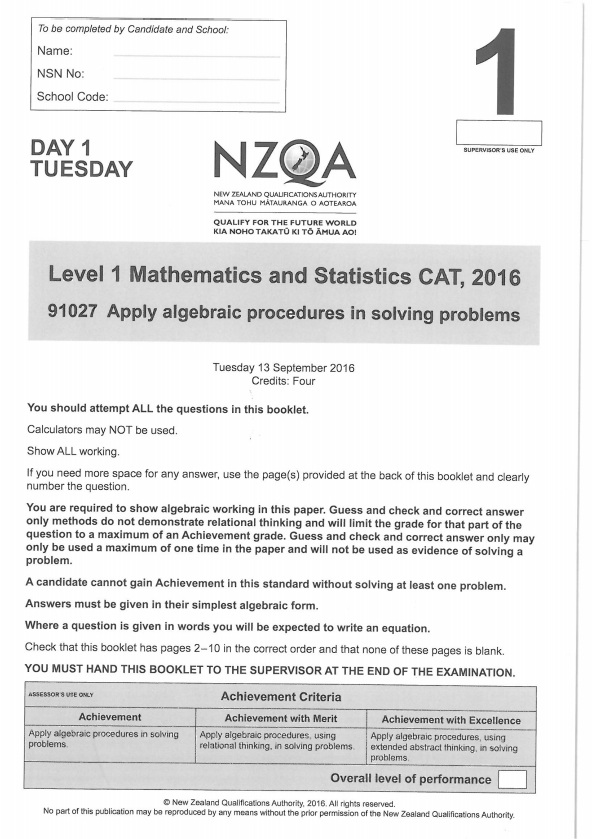 Algebra , mathematics (pangarau) achievement standard. Exemplars of student work or expected student responses (written by subject moderators) have been developed for level 1 achievement standards. For ncea level 1 select 'on track 3' or 'fast track 3' or any of the single standard ncea level 1 maths or stats workbooks shown below.